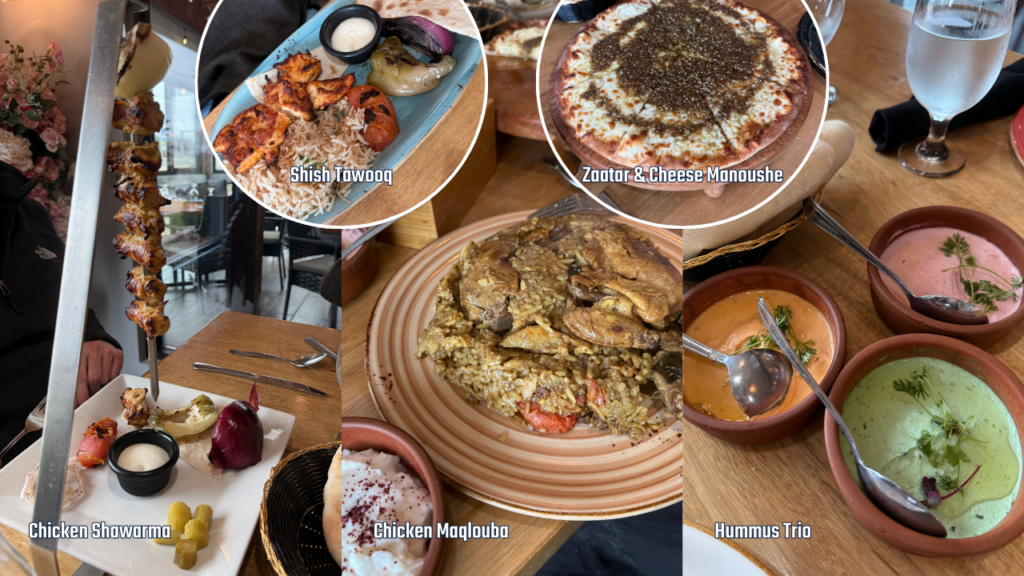 You’ll find hearty dishes like chicken maqlouba and fukhara (slow cooked stews) along with grilled dishes like beef, chicken, or kafta shawarma and kebabs, and lighter seafood options like fish simmered in tomatoes and or tahini.